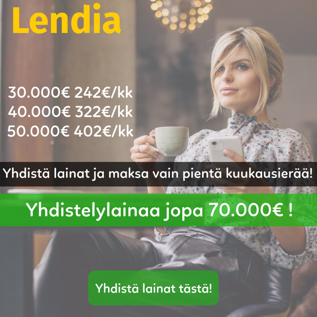 Lendia on kotimainen lainojen kilpailuttamispalvelu jonka kautta tuhannet tyytyväiset asiakkaat ovat saaneet helposti 20.000€ – 70.000€ kokoisia lainoja ja yhdistelylainoja!